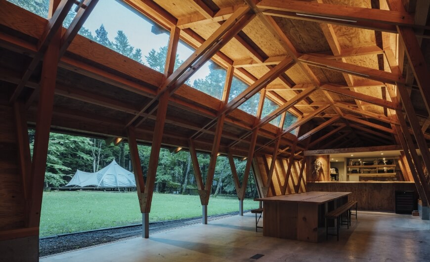 野鳥の声と木々の香りに包まれたテント内には、特注家具を配した快適空間をご用意。